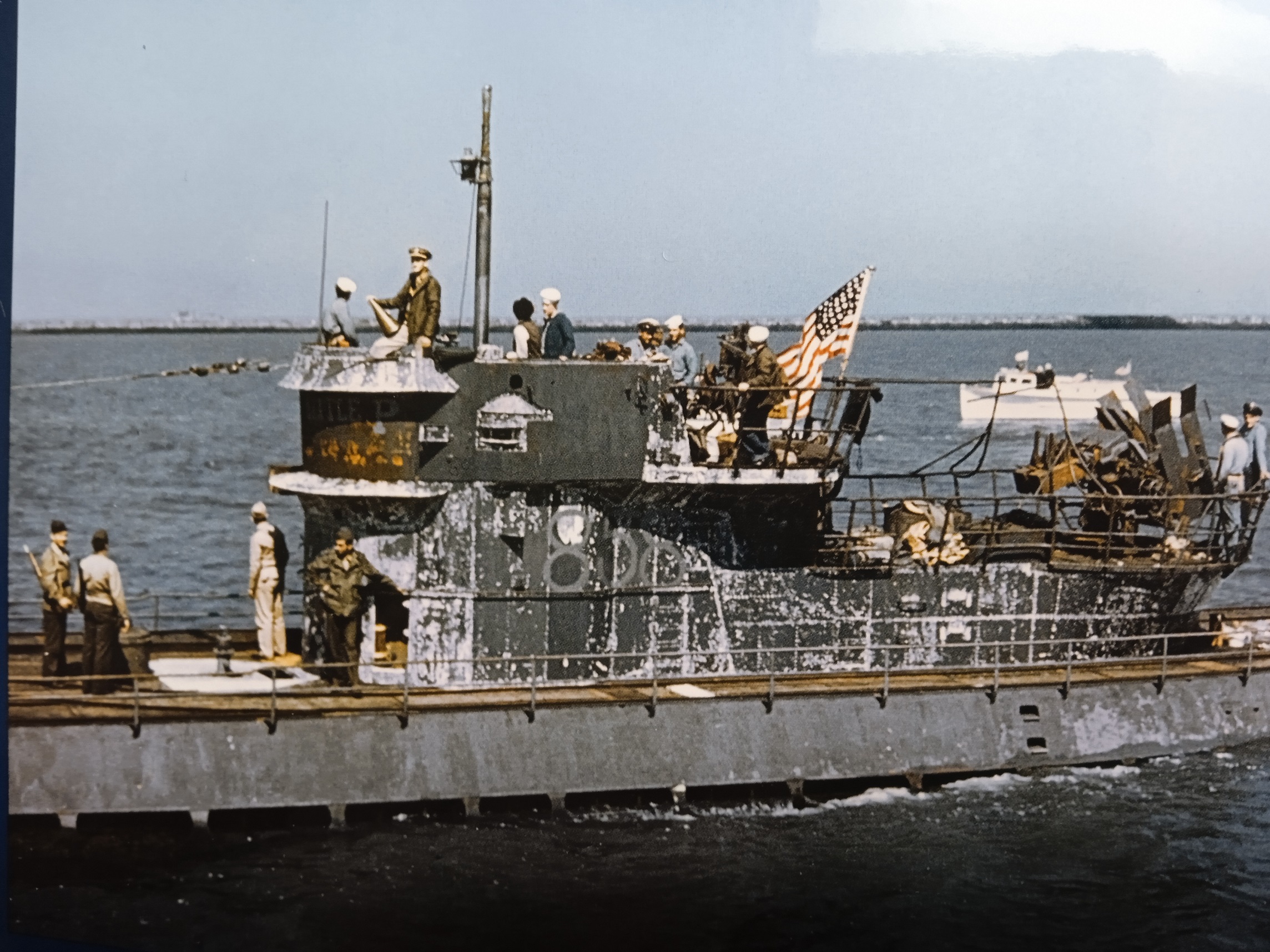 The crew set charges and abandoned the sub but it did not sink immediately, as it was not scuttled with only a few valves opened and the engines left running. The sub continued along the surface in a slow circle with a damaged rudder and was quickly intercepted by US Navy crew from another destroyer in the group. They closed the valves, disarmed the charges and stopped the sub from completely sinking.