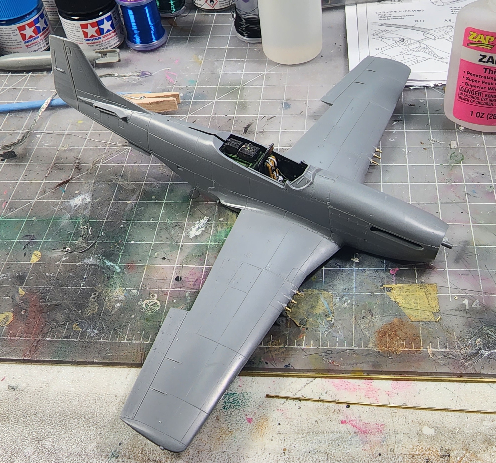 I looked through my collection of decals and found some for the instrument panel for a P-51D. Yay! I wouldn't have to paint those tiny dials by hand! Wrong. They were so old that after 4 attempts I gave in and hand painted the dials and what not. I used my fly fishing resin and made glass for the dials. It really does look better than those dumb decals anyway.