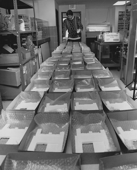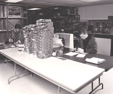 After a few months we added on another room and then, in 1986 we moved into a much larger area, number 25 cross keys center. It was about 7,000 square feet in size, about triple the space we had previously. In these photos, we were planning the remodeling! We had so many big dreams in those days! Here we are planning the layout of the sales floor. Back then, we had the sales floor and the products in close proximity as the sales people would take an order, then pull the products and take them to shipping at the rear of the facility.