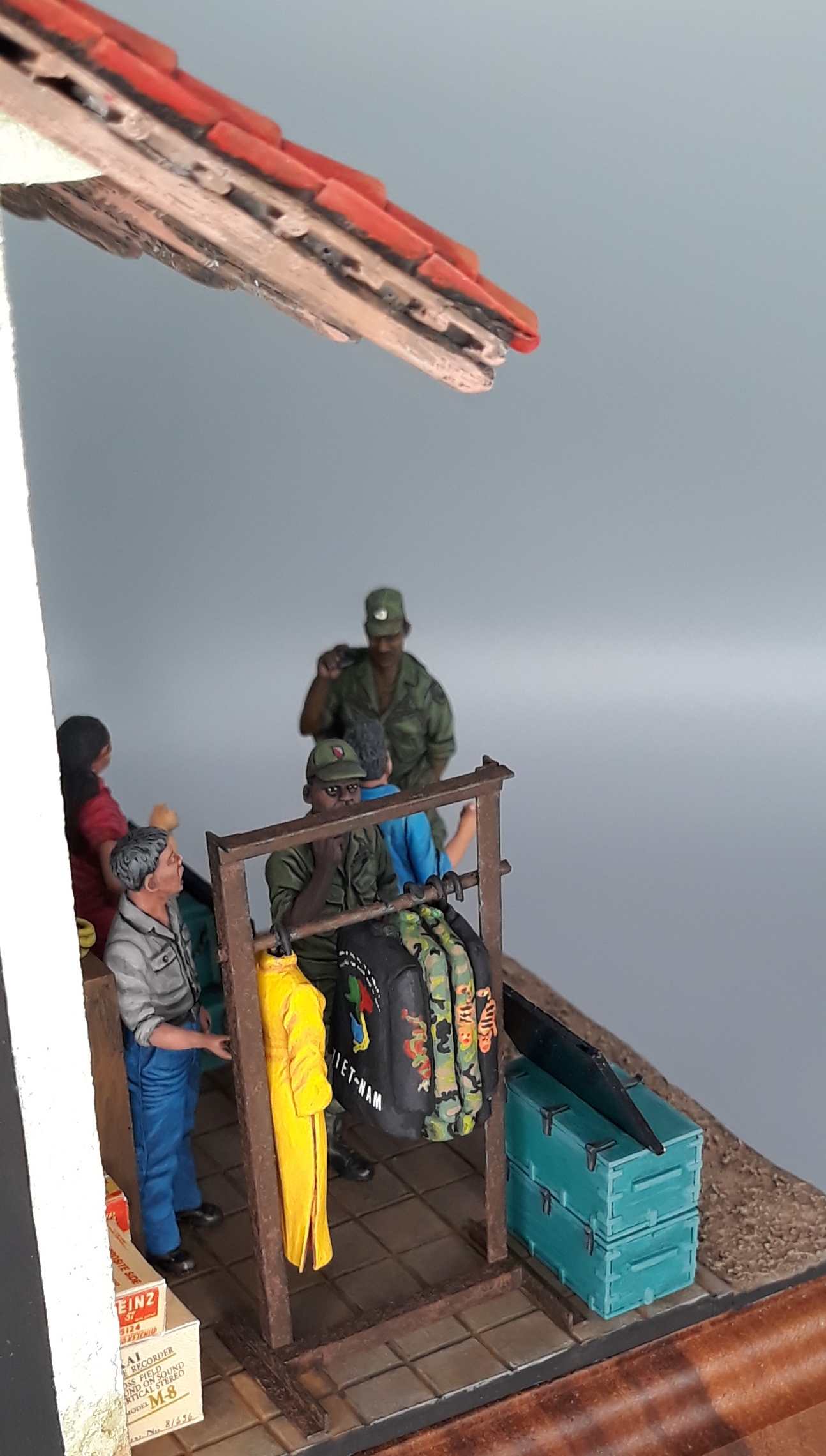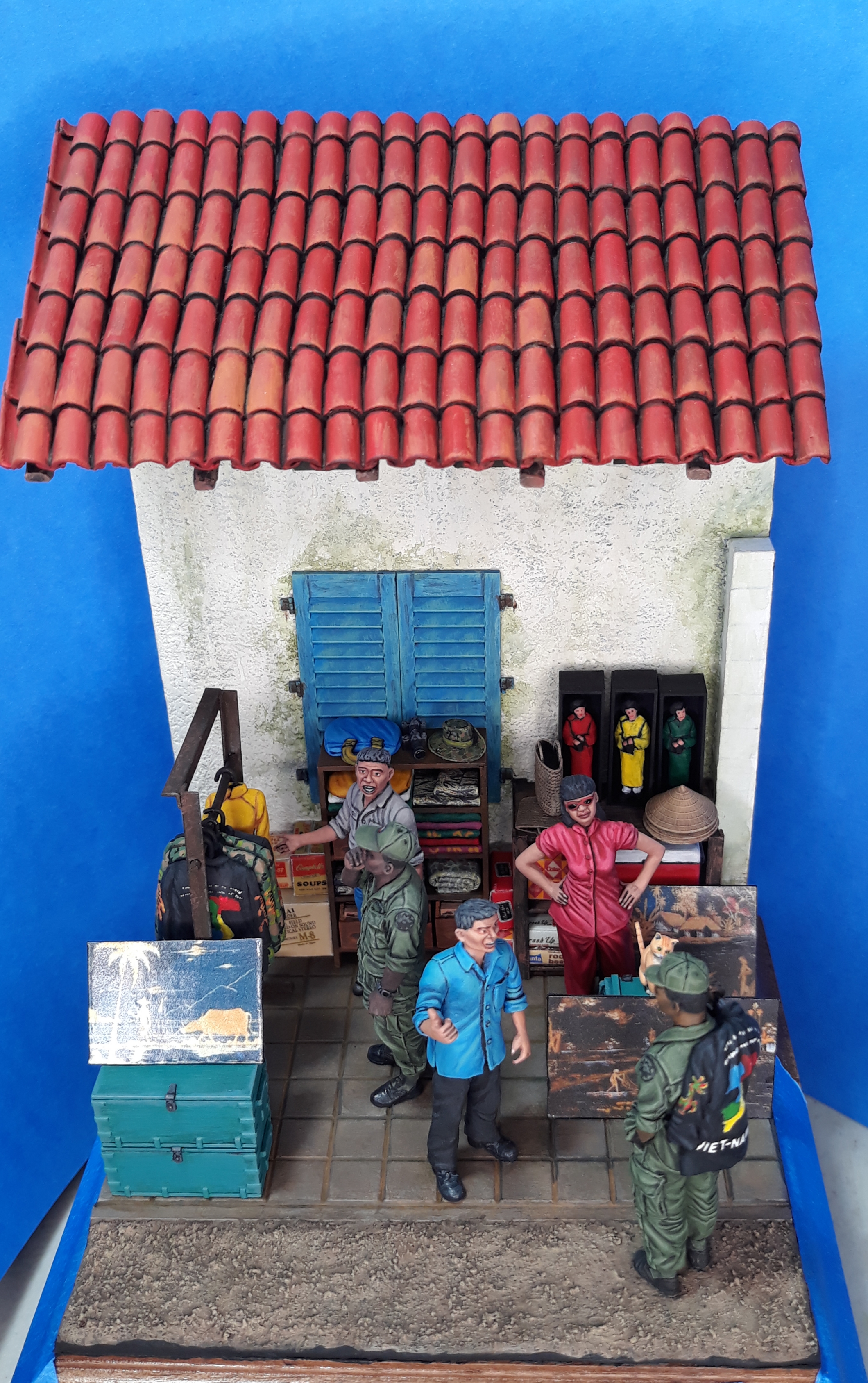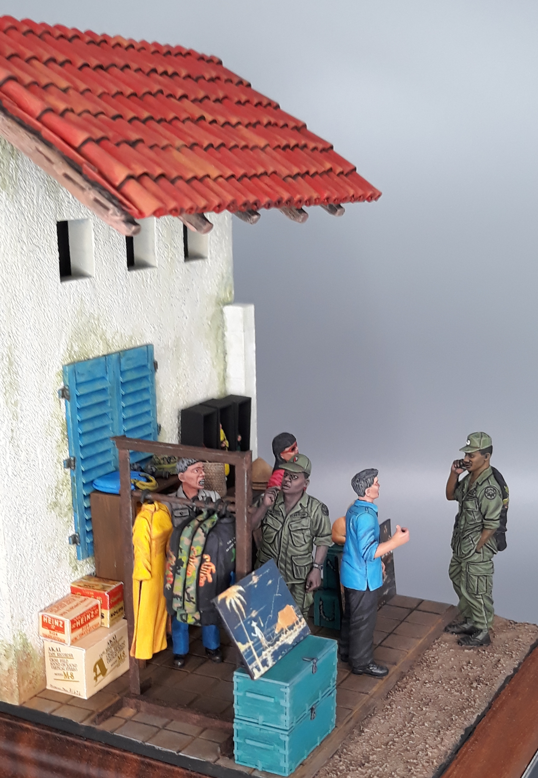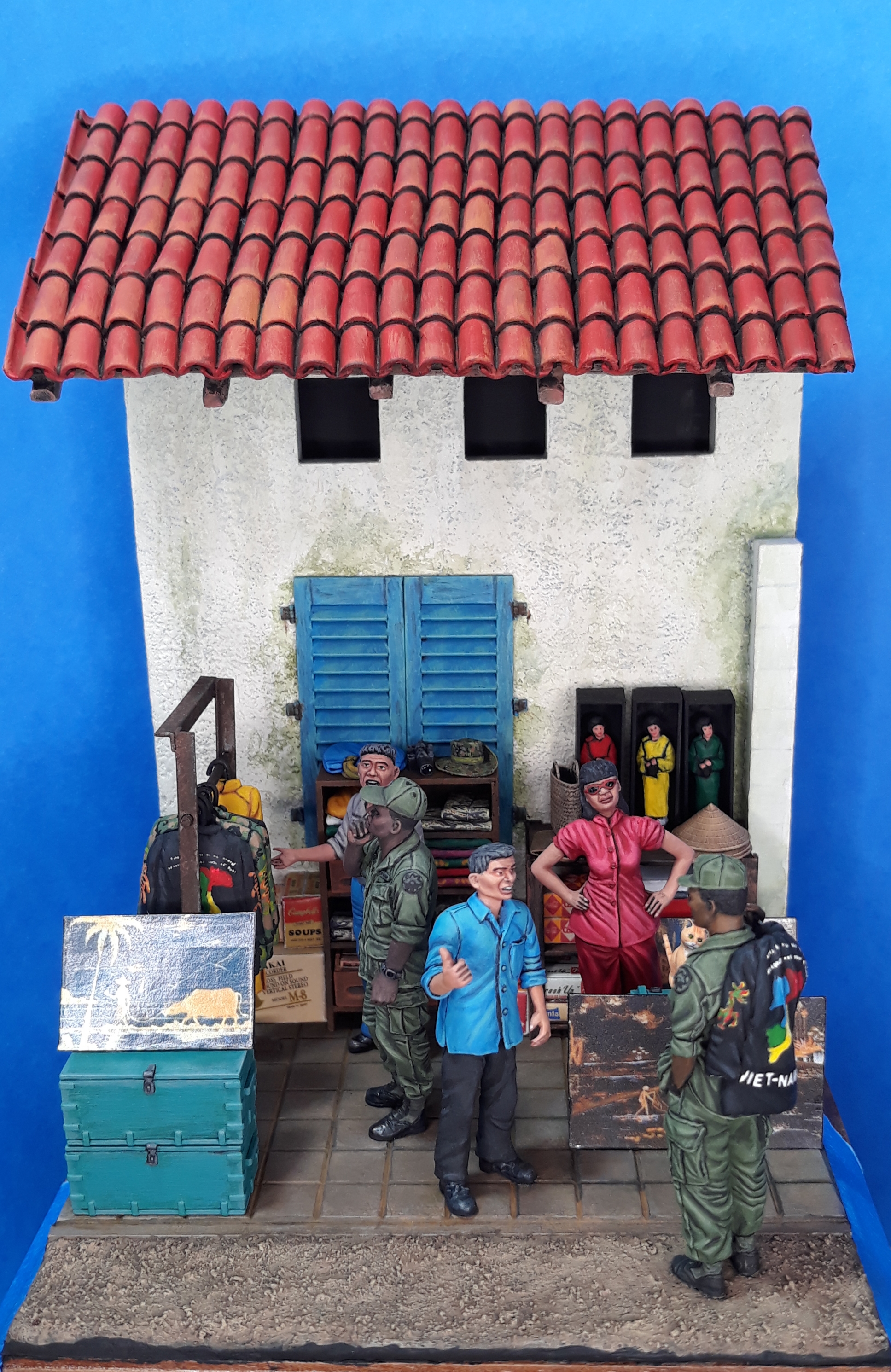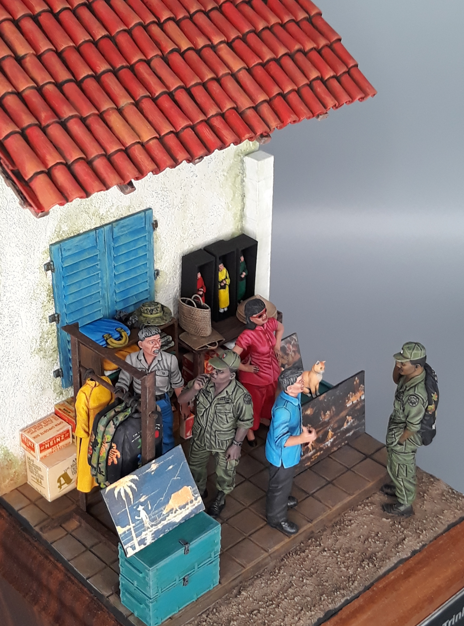 Well, I took some better photos of this diorama this afternoon. I took some at the show, but the majority of my photos were really blurry for some reason. These that I took in my pop up photobooth seem ok. There are a bunch of them from various angles. Then there are two photos of the three pieces that make up the "Shopping in Long Thanh" series, one showing my display at the show and another in the photobooth.