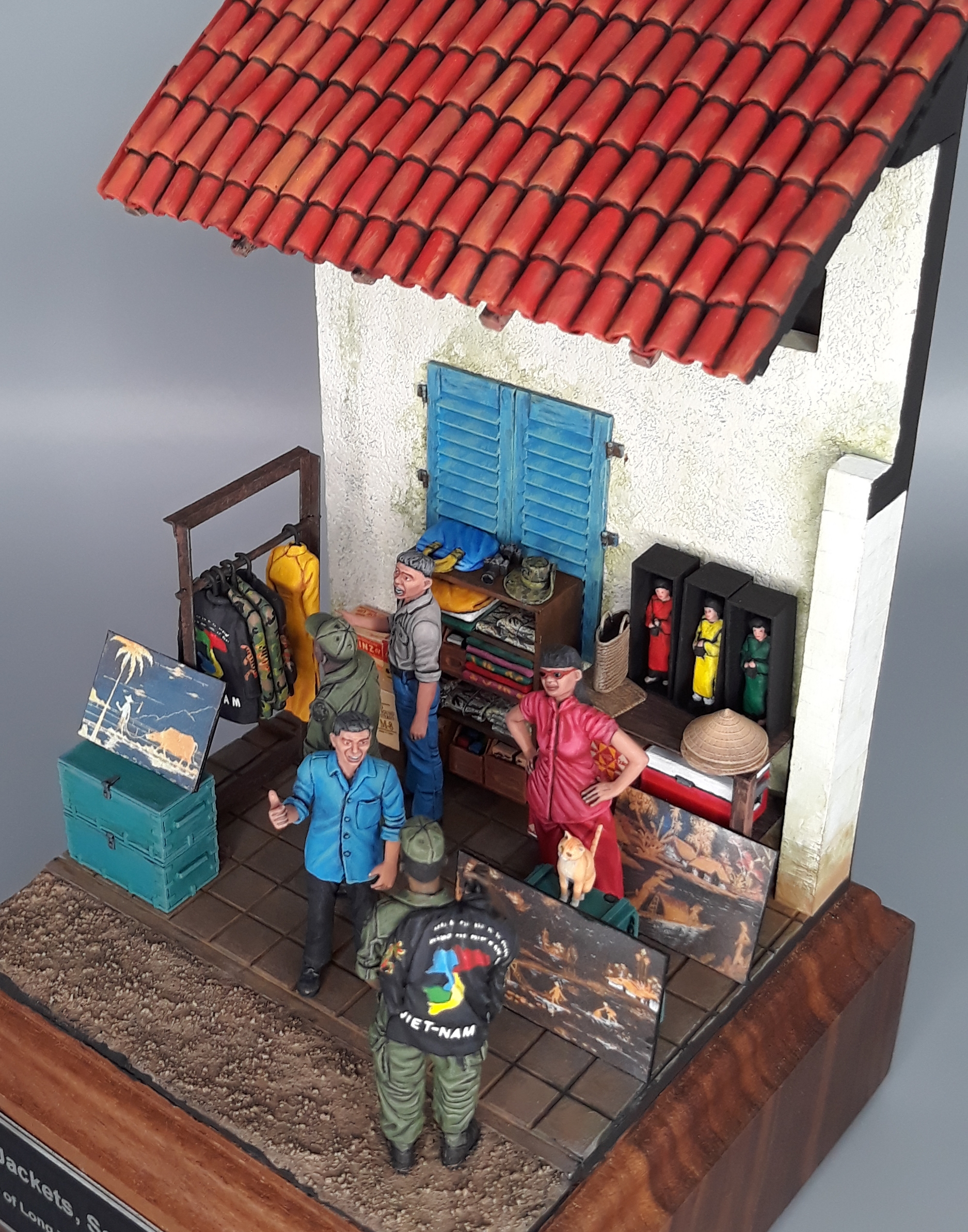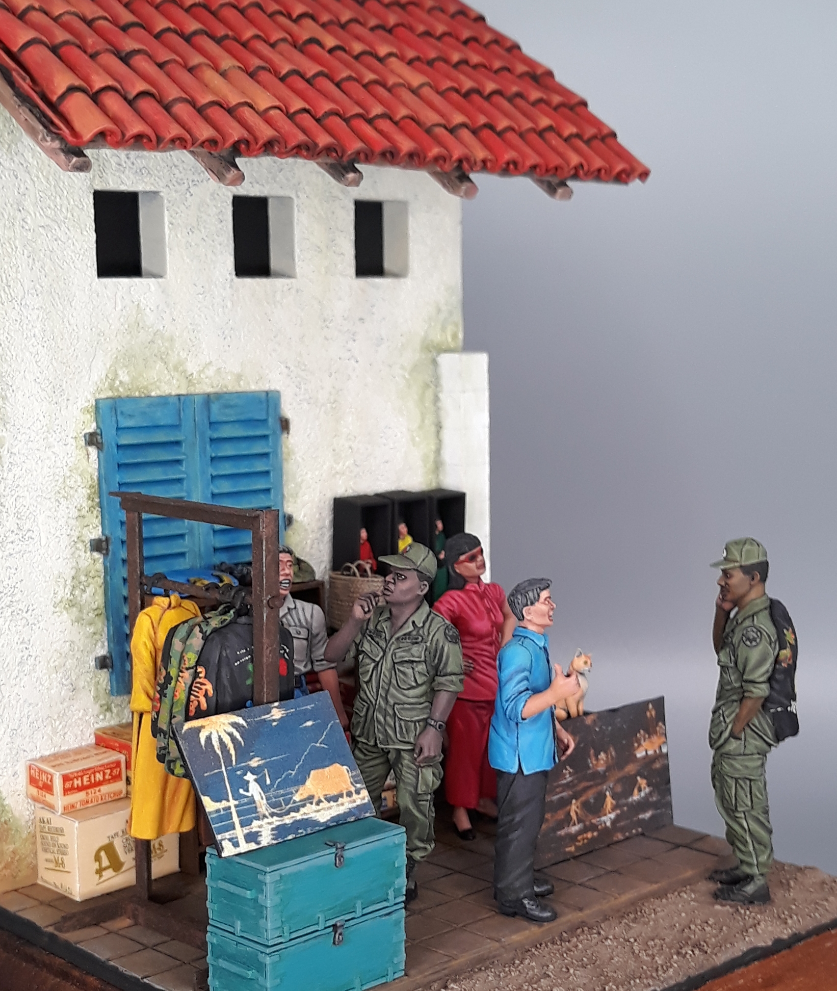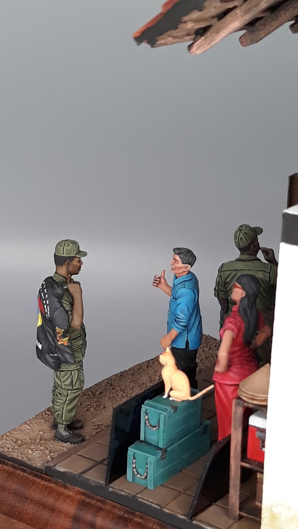 When I was planning the layout for my display for the show, I saw that the groundwork method I used for the "Buying Baguettes and Banh Mi" diorama did not match what I used for this diorama and the vignette "GI! GI! You Buy!", so I textured and repainted the dirt areas the best I could in order to give continuity among the three works.