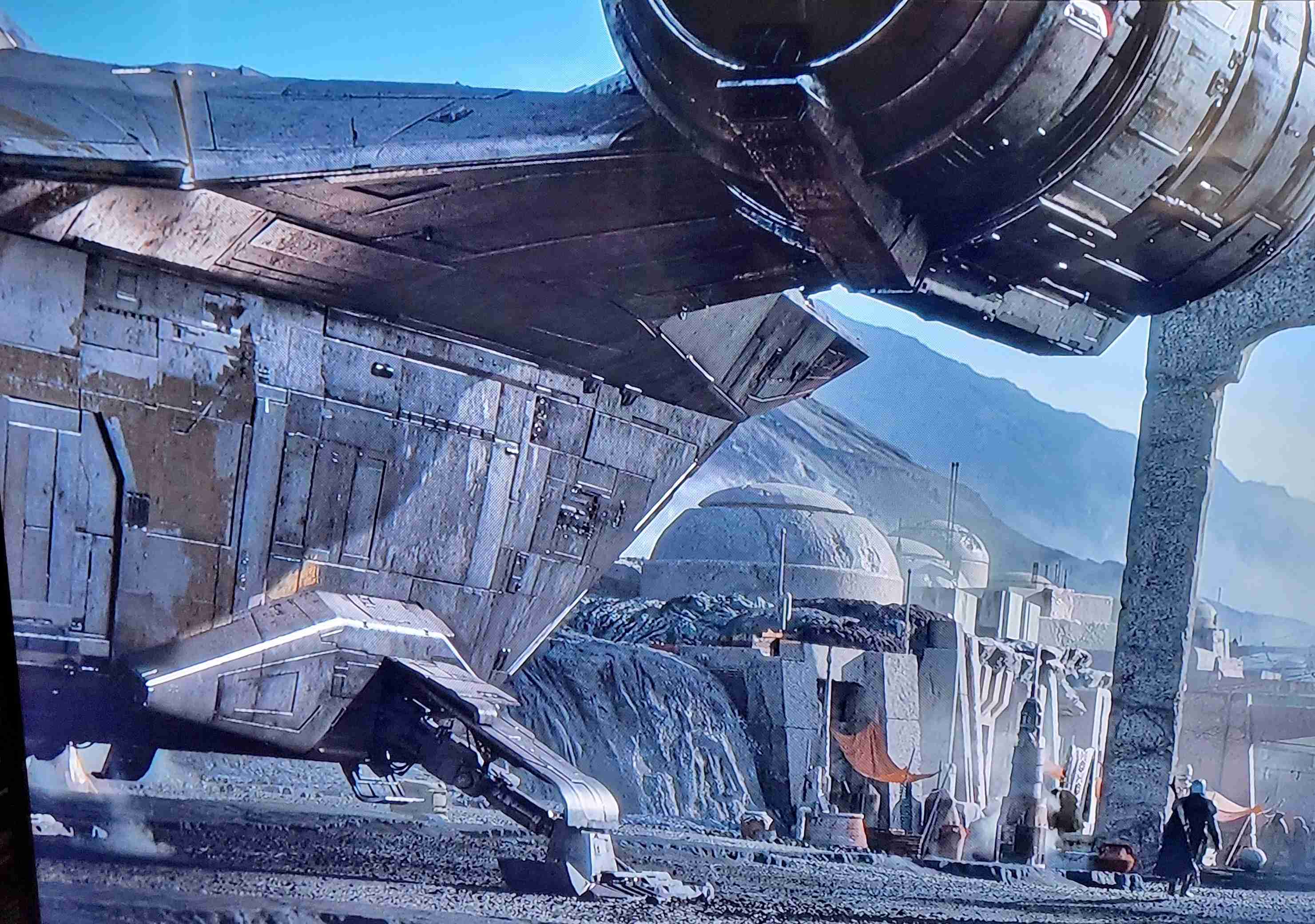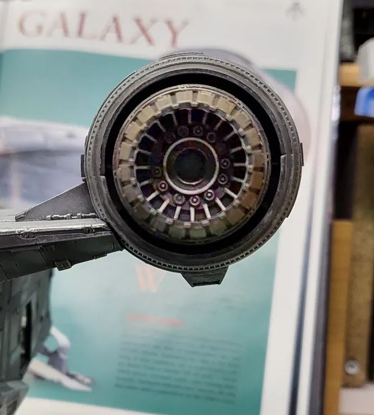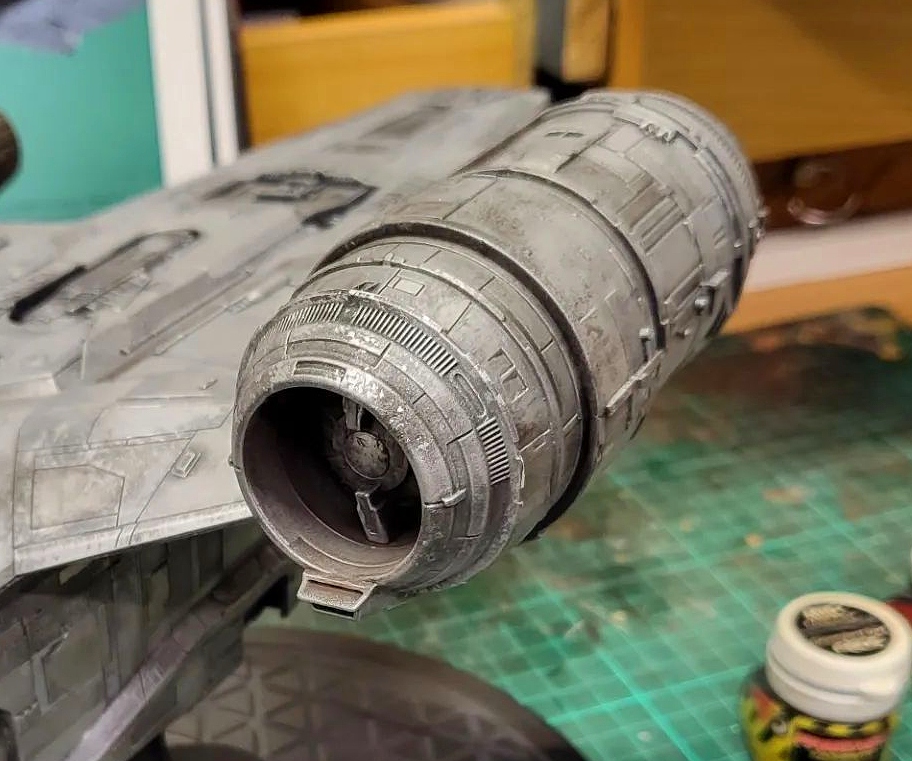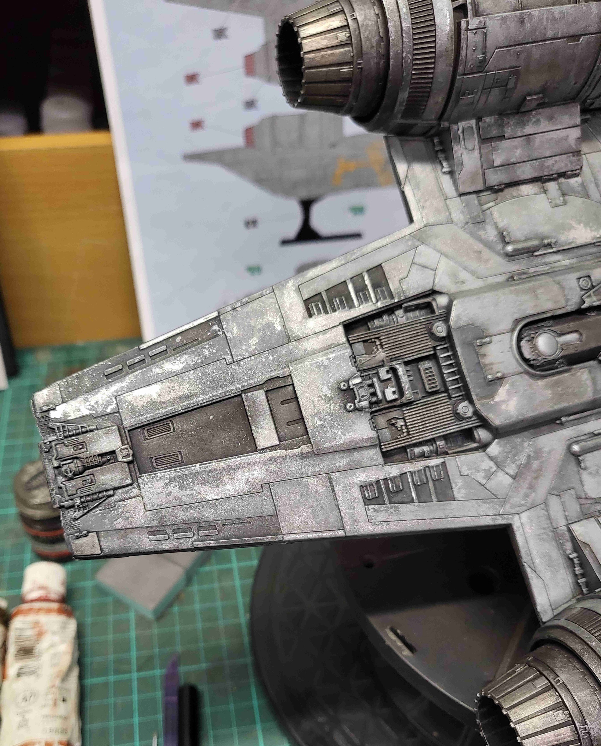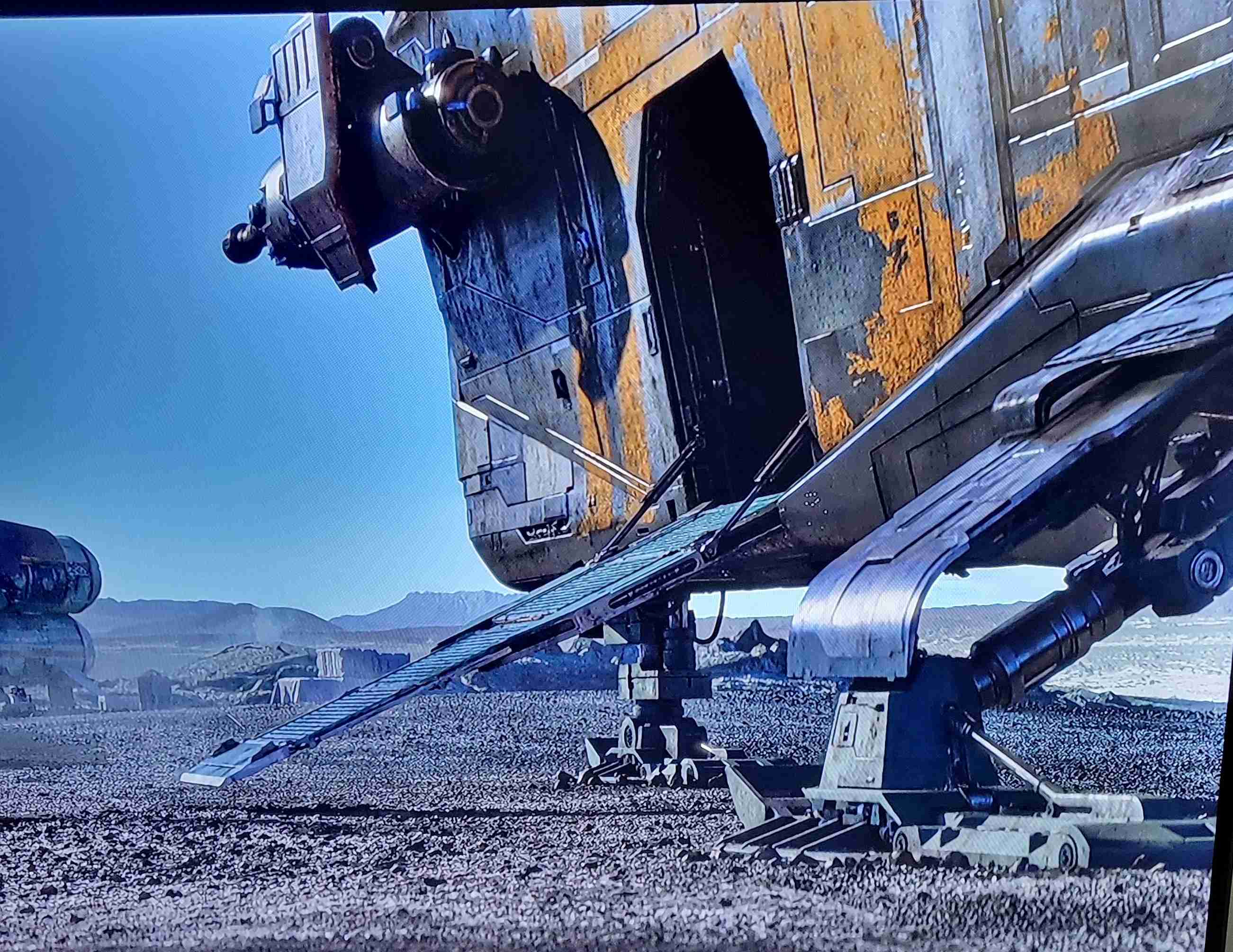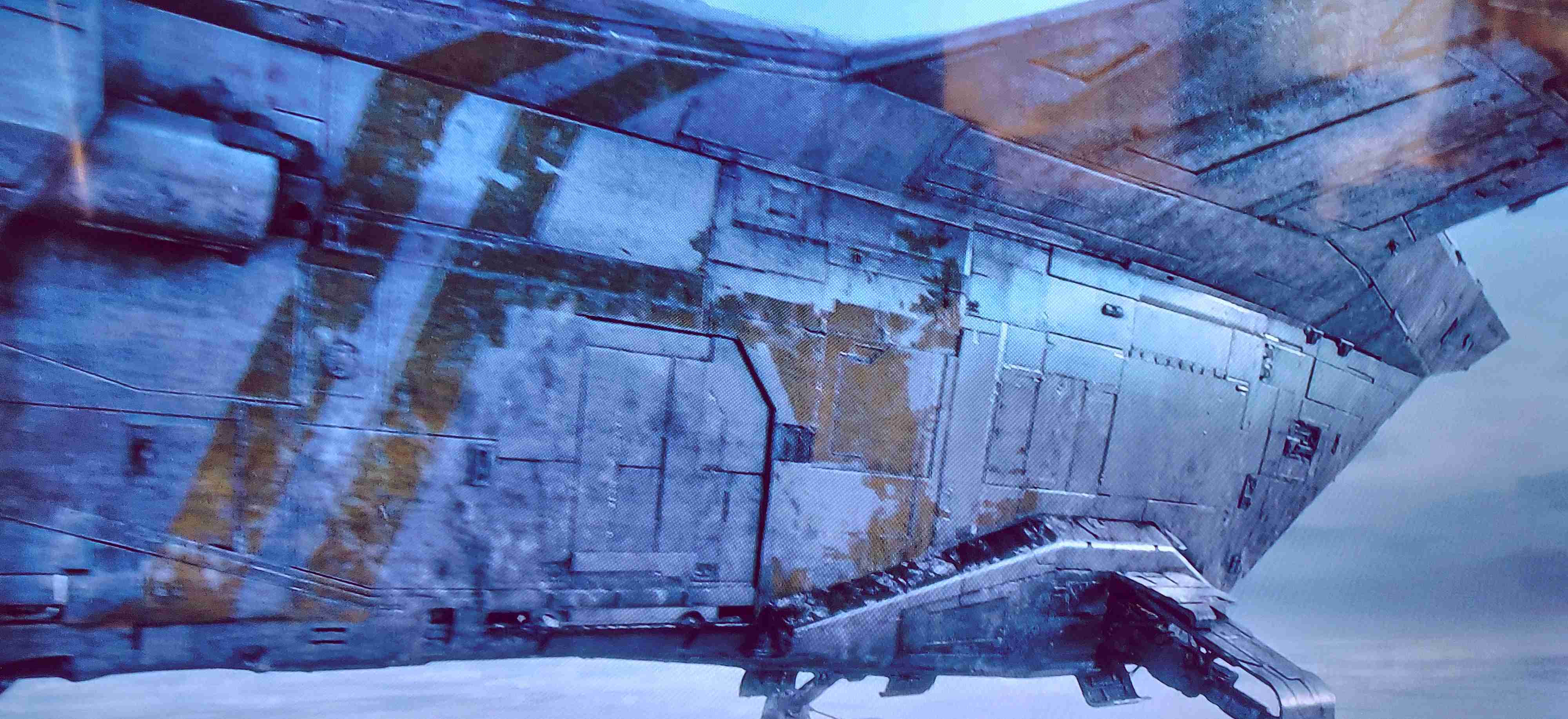 I took these shots off the TV from episodes 1 and 3 to show what I am going for in detail. The colors vary due to the tone of the image on screen and the camera in my phone trying to handle it, especially the bluish shots that I had to try and color correct as much as I could. Overall the best color match is with the first 4 photos but all of the 'snaps ' clearly show the rugged and weathered apperarance of the metal plates of the ship and the multiple shades of steel, aluminium and chrome that will be needed. Black and dark browns will also play a major part with panel line enhancement and metal plate differentiation.