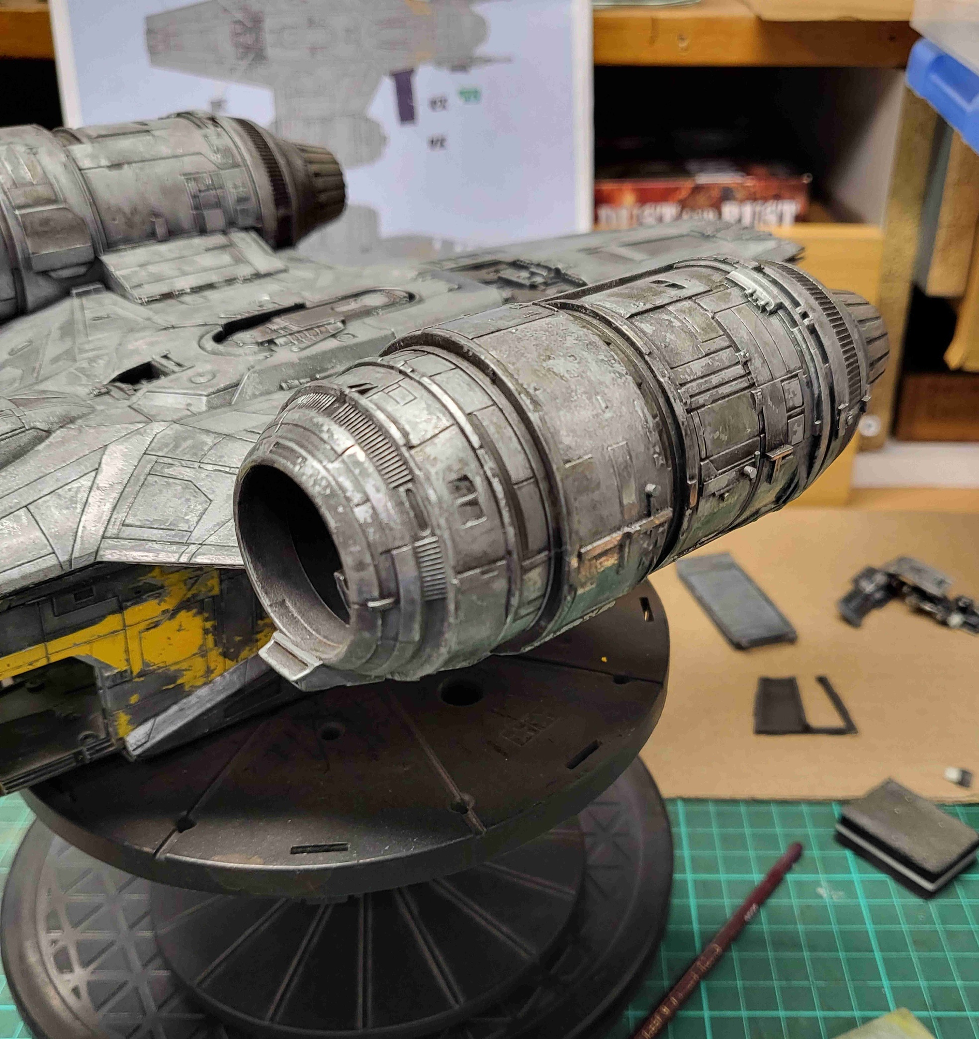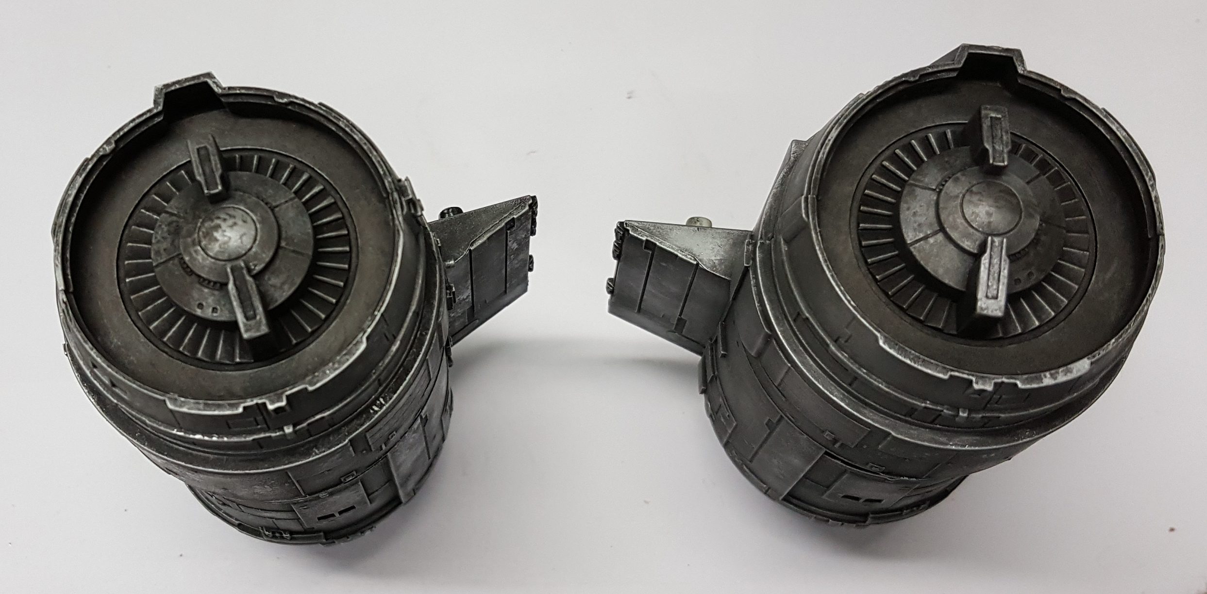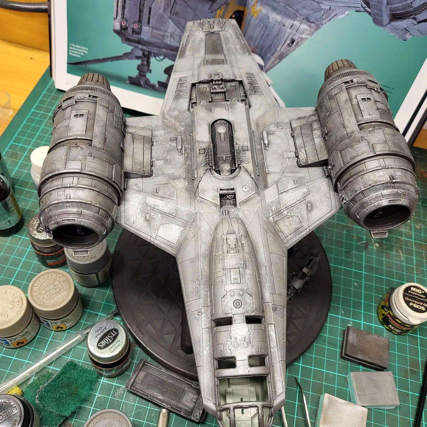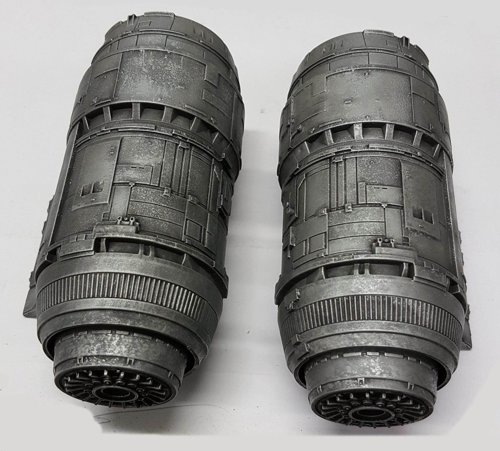 I took these shots off the TV from episodes 1 and 3 to show what I am going for in detail. The colors vary due to the tone of the image on screen and the camera in my phone trying to handle it, especially the bluish shots that I had to try and color correct as much as I could. Overall the best color match is with the first 4 photos but all of the 'snaps ' clearly show the rugged and weathered apperarance of the metal plates of the ship and the multiple shades of steel, aluminium and chrome that will be needed. Black and dark browns will also play a major part with panel line enhancement and metal plate differentiation.