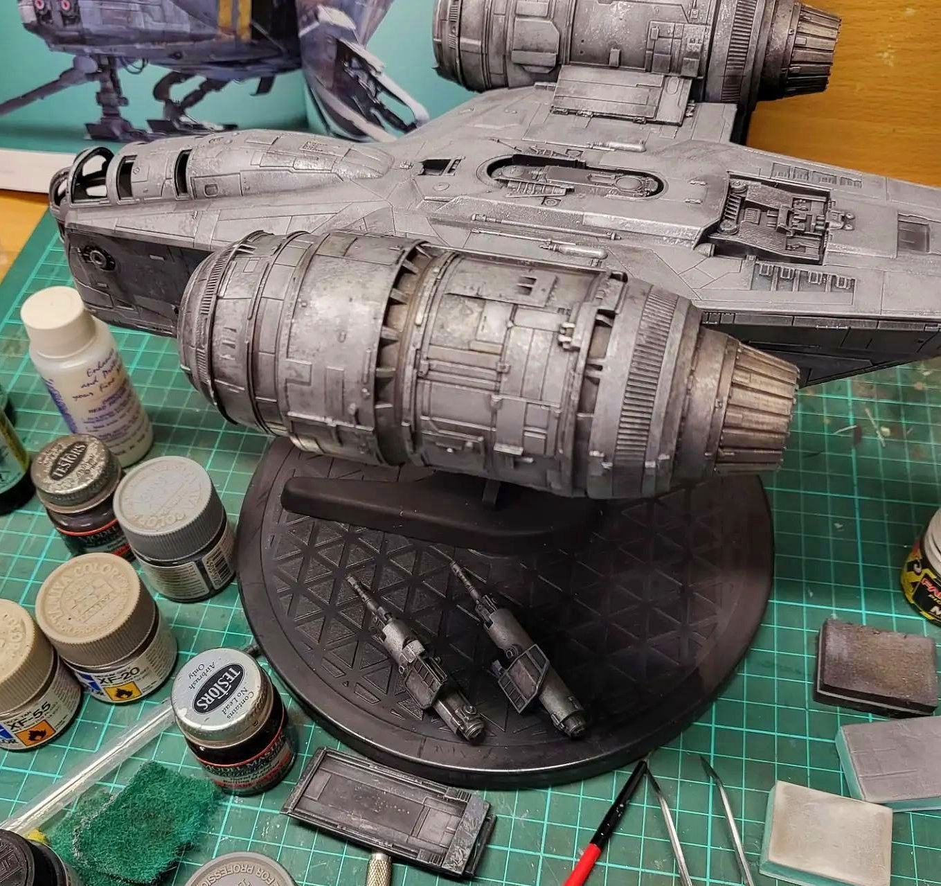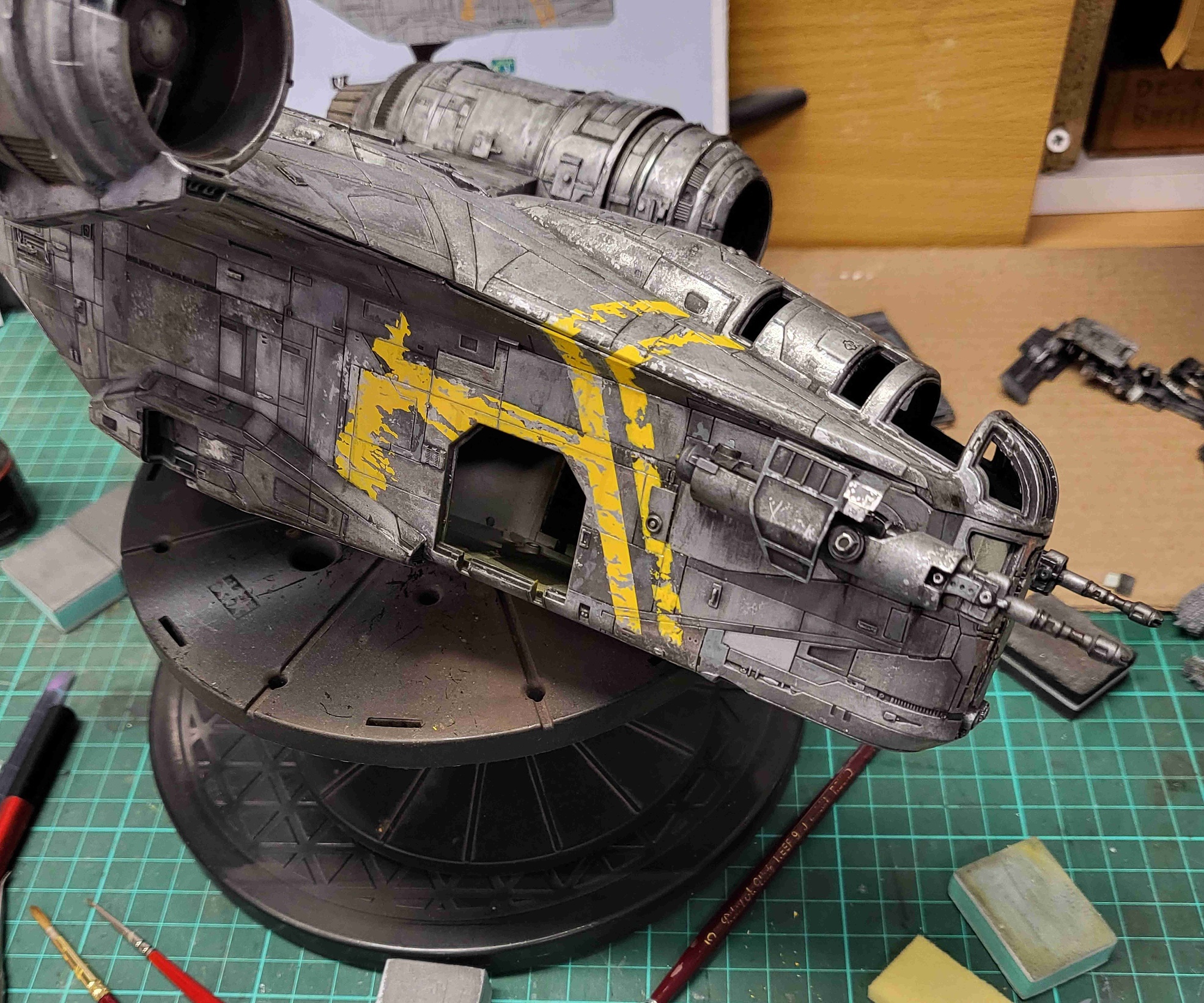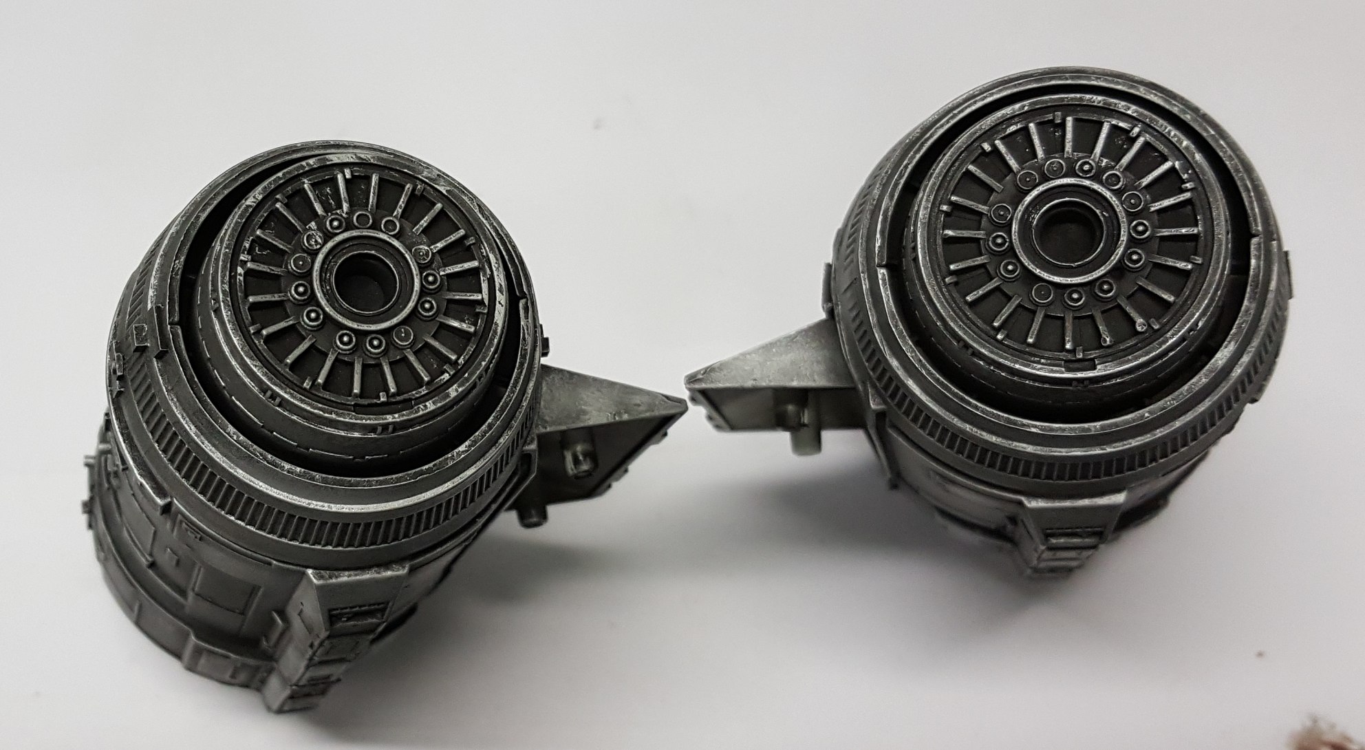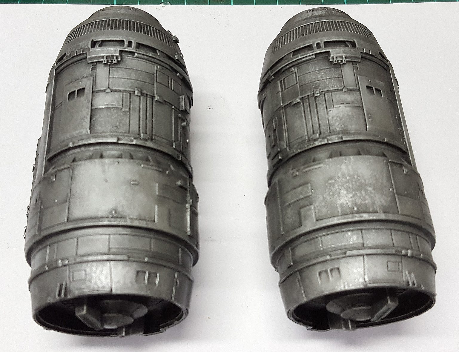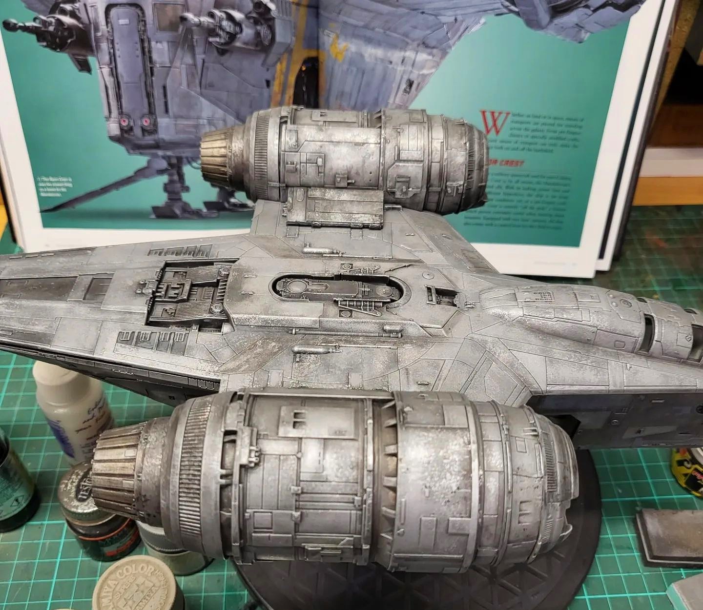I took these shots off the TV from episodes 1 and 3 to show what I am going for in detail. The colors vary due to the tone of the image on screen and the camera in my phone trying to handle it, especially the bluish shots that I had to try and color correct as much as I could. Overall the best color match is with the first 4 photos but all of the 'snaps ' clearly show the rugged and weathered apperarance of the metal plates of the ship and the multiple shades of steel, aluminium and chrome that will be needed. Black and dark browns will also play a major part with panel line enhancement and metal plate differentiation.
