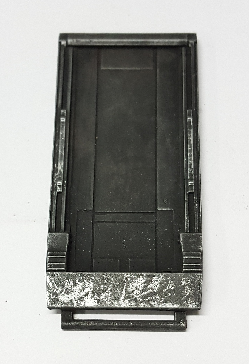 To underpin the metal weathering I needed to start with a black primer. This base will provide all the shadows, dark patches and uneven finish for the metal plates. I also went with some airbrushed stencil patches in dirty browns made from black, dark iron and red brown acryclics *(all Tamiya). This idea may not work everywhere, especially where the metal paints are more opaque but hopefully in the darker , more 'unpainted' areas it will help.