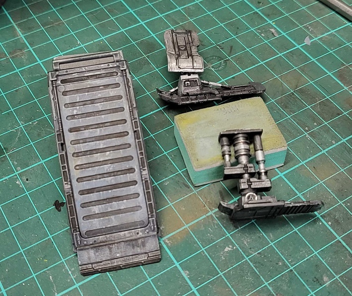 I mean, whatever right, this is all about experimentation and what doesn't work with this may work well for another model. This is how I always discover new methods and happy accidents. The focus is the variation in the metal plates combined with subtle dirt and grime - most of the plates are not just a perfect finish so this is why I will be building most of this surface effect up with traditional dry brushing of multiple layers, combined with stippling of more solid colors and detailed brush work, finishing with oil paints and pigments.